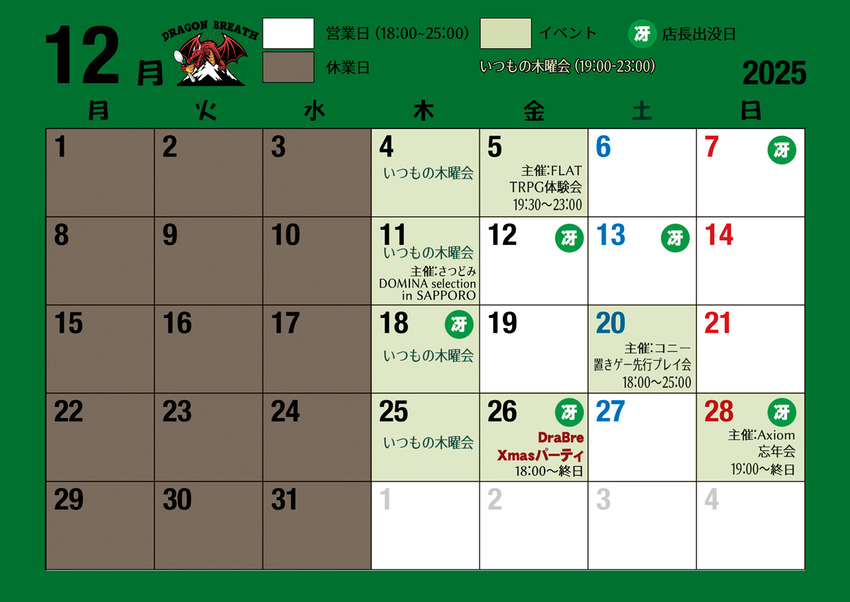 01[基本コース(120分)]2600円 飲み放題!遊び放題!駄菓子食べ放題! 02[単品コース] 60分1オーダー制(+チャージ600円) 03[120分カリープラン]3600円 基本コース+スープカリー(並盛)付き 04[240分カリープラン]3900円 基本コース+スープカリー(並盛)付き 05[240分三大放題プラン]3000円 飲み放題!遊び放題!駄菓子食べ放題! 06[いつもの木曜会(終日)]2600円 飲み放題!遊び放題!駄菓子食べ放題! |